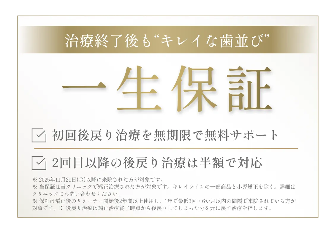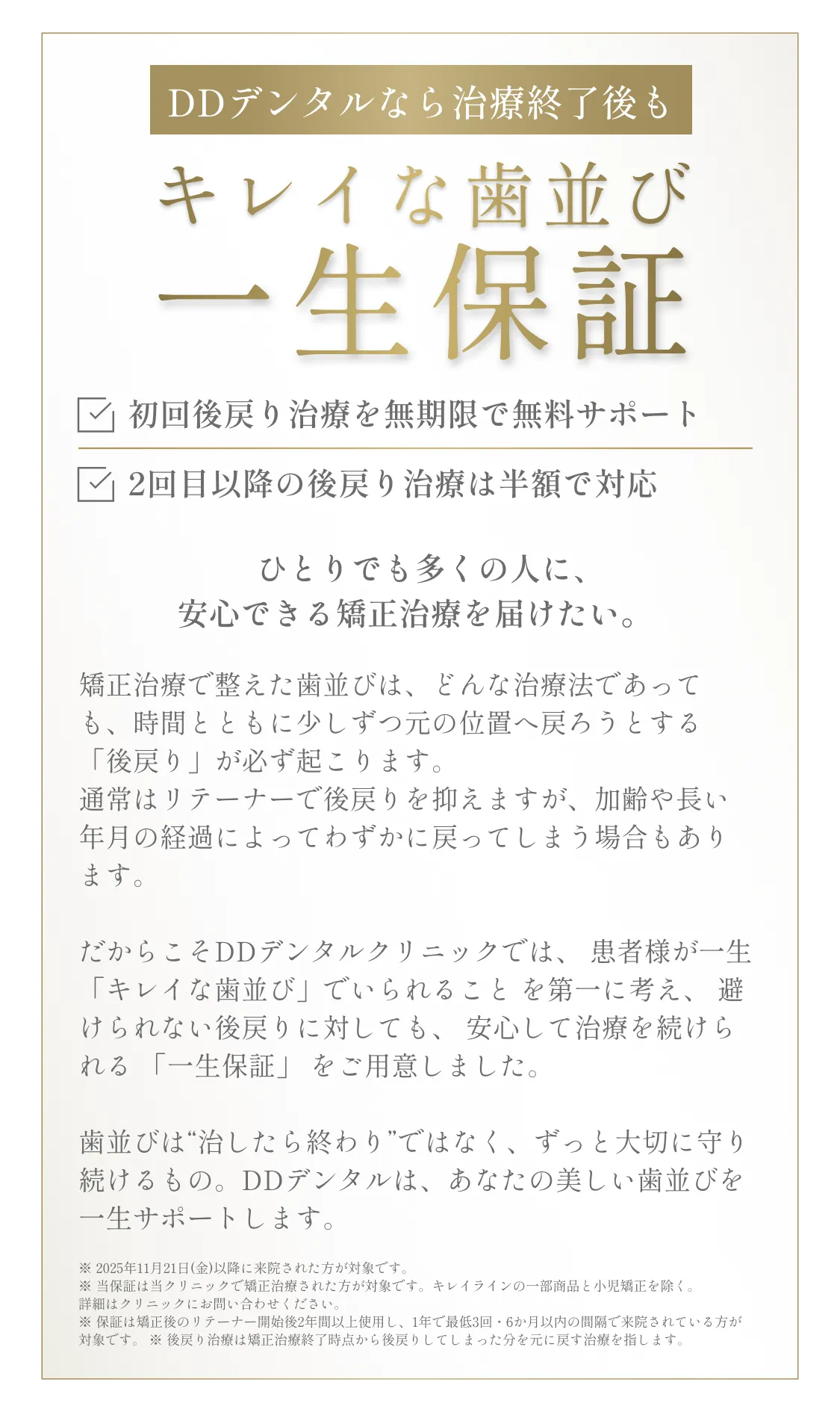 ※上記に記載している費用以外に、来院1回につき5,500円(税込)の再診料、リテーナー費用(上下セット)22,000円(税込)が別途発生します。